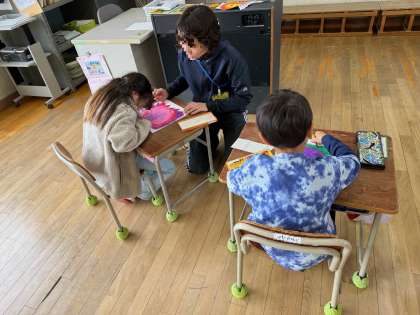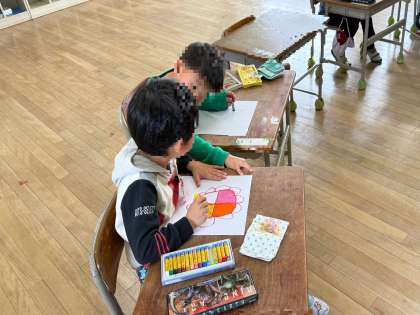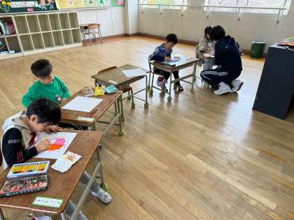 いろやかたちをくふうして、おもいおもいにえがいています。