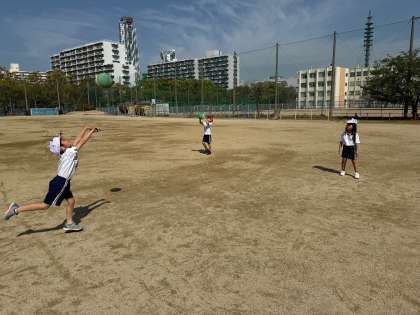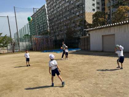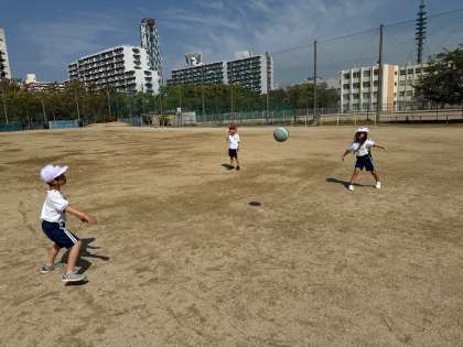 ボールをつかったうんどうです。おおきいボールをりょうてをつかってなげます。