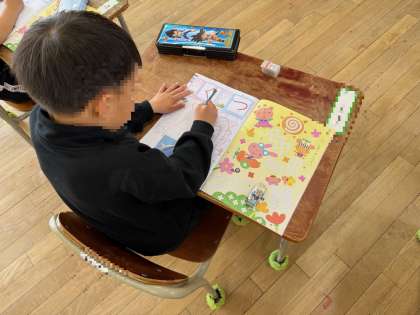 ひらがなのれんしゅうです。かくときのしせいにきをつけ、かいています。