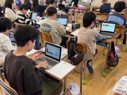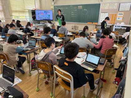 タブレットや地図帳を使い、調べる国の情報をさがしています。