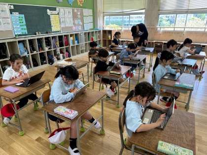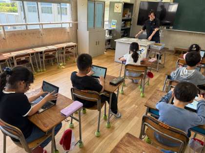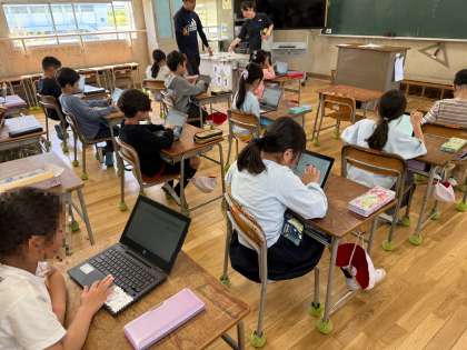 今日は視力検査がありました。終わった子どもたちが教室にもどってきて、タブレットで学習しています。デジタルドリルをしています。