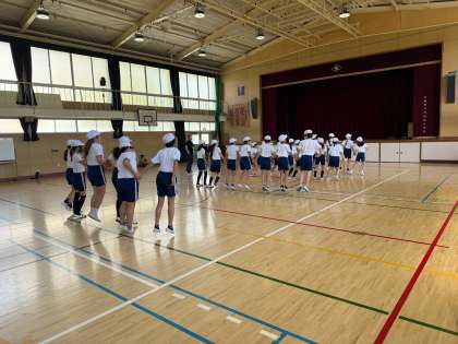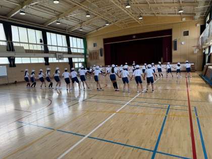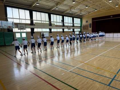 手をつなぎ、リズを合わせて左右にとびます。だんだん列が長くなり、最後は一列になってとびました。