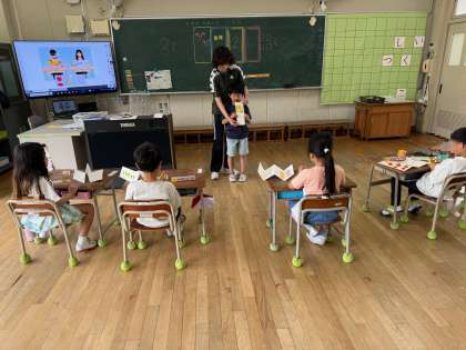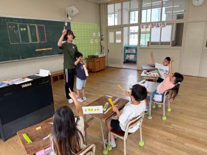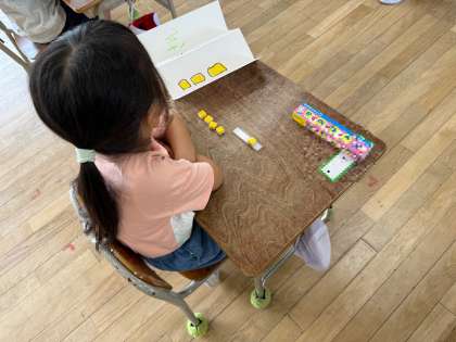 まえのひとがだしたものとおなじかずのぶろっくをならべます。そして、すうじをそらがきしてよみます。
