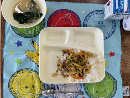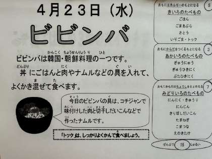 今日のこんだてはビビンバ・トックです。ビビンバは混ぜご飯のことで、子どもにも大人気でした。