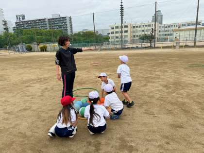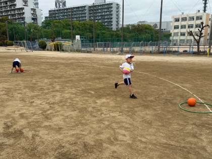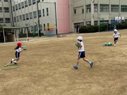 きょうは、うんどうじょうでたいいくです。うんていやてつぼうなどをしたあと、ボールをつかったあそびです。