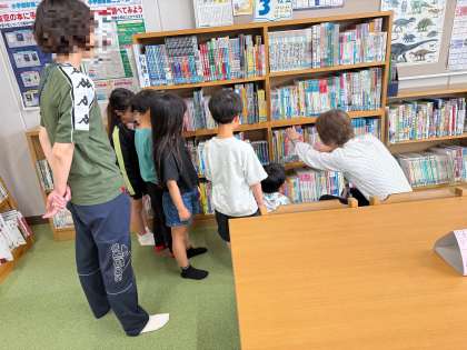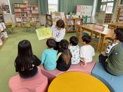 どこにどんなほんがあるかおしえていただきました。また、えほんをよんでもらいました。むちゅうになってきいていました。