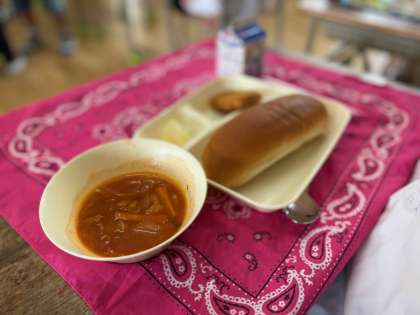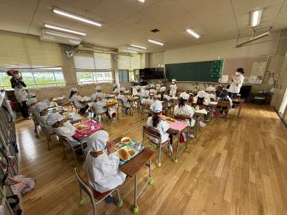 給食の時間に放送委員会がスーパースマイルラジオを放送しています。楽しいクイズの後、音楽をかけてくれます。