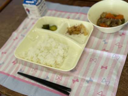 今日のこんだては、肉じゃが・きゅうりの酢のもの・ごまかかいためです。ごまかかいためは、たけのことかつおぶし、いりごまをいためたもので、ごはんとよくあっています。