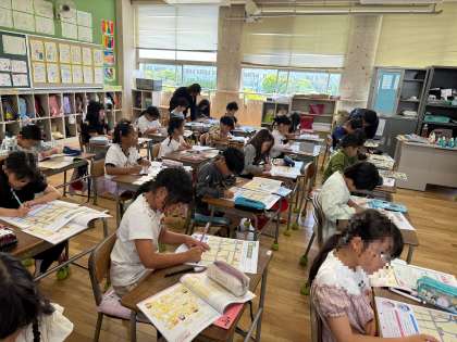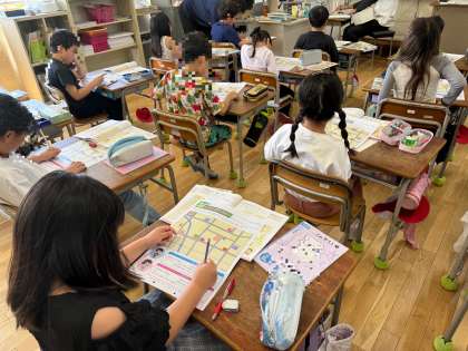 地図記号について調べています。絵地図上を道なりに移動していきます。その際、地図記号を確かめていきます。