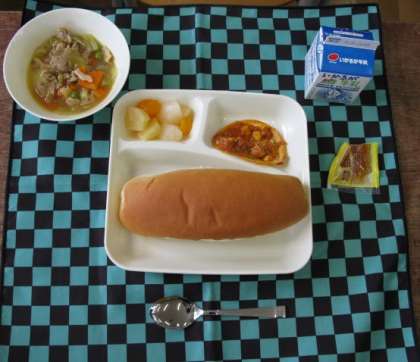 今日のこんだては、ぶたにくとやさいのカレースープ煮(に)・かわりピザ・ミックスフルーツかんです。