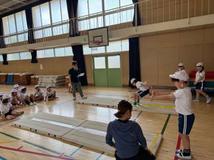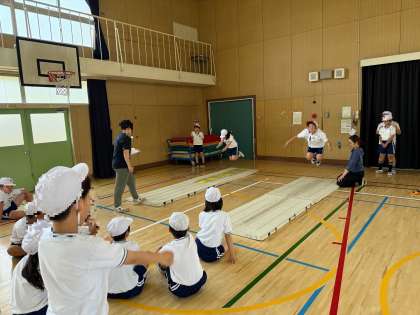 立ちはばとびです。うでを大きくふり、タイミングよくとんでいます。