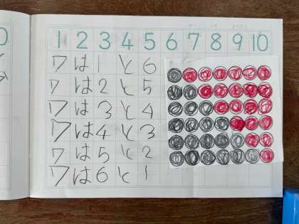 きょうは、「7」についてがくしゅしました。1と○でいくつ、2と○いくつというかんがえができています。