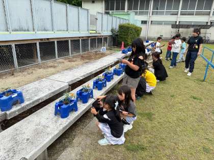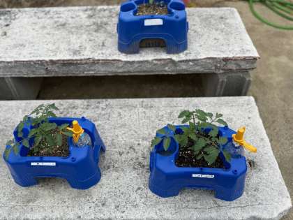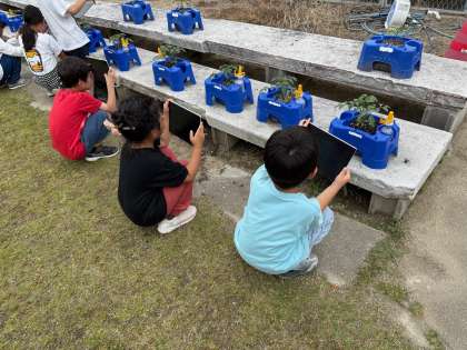 タブレットたんまつを使い、さつえいしています。ミニトマトは、じゅんちょうにせいちょうしています。