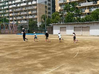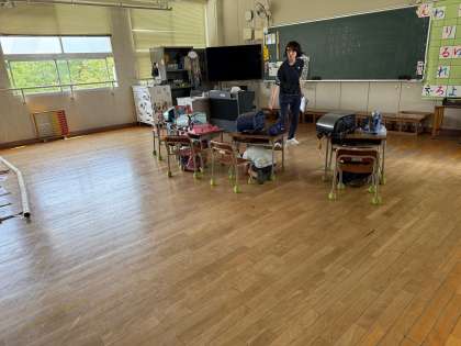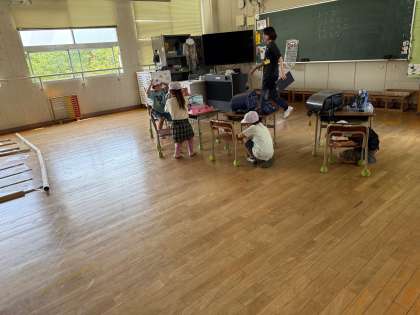 避難訓練開始です。1年生も先生の指示に従い、避難しています。