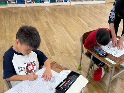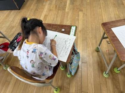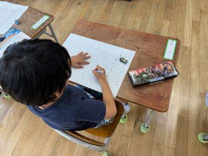 さくぶんをしています。ならったひらがなをつかって、1がっきたのしかったことをかいています。