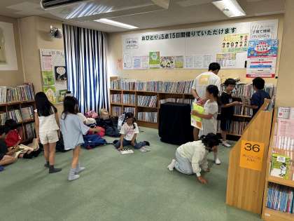 紙芝居で図書館のことを教えてもらったり、大型絵本の読み聞かせをしてもらったりしました。その後、自由に見学しています。