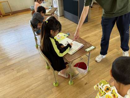ひらがなのかきとりです。せんせいがいったことばを、のーとにかきます。