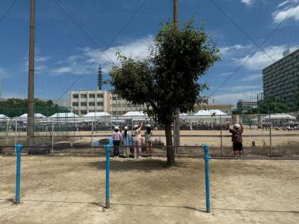 今日は、隣の南港北中学校で、体育大会が行われています。中学生が一生懸命がんばっているようすを南港光小の子どもたちも応援しています。