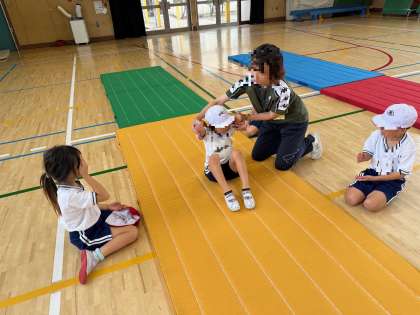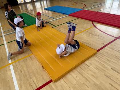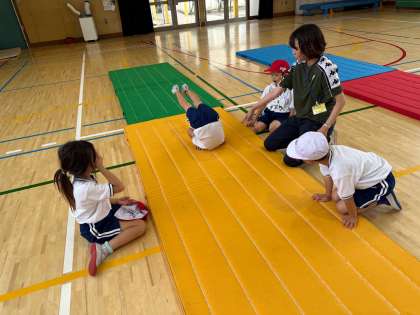 うしろまわりです。みみのよこにてをもってきます。そして、まわるときにあごをひきます。