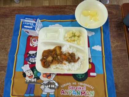 きょうのこんだては、ハヤシライス・キャベツとコーンのサラダ・りんご(カットかん)です。ハヤシライスはさんみとあまみのバランスがよく、おいしかったです。