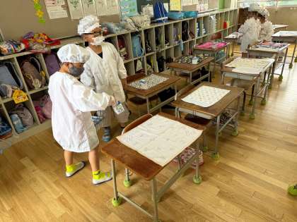 1ねんせいも、2ねんせいといっしょに、きゅうしょくとうばんのしごとを、いろいろとできるようになりました。