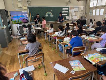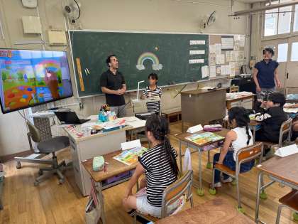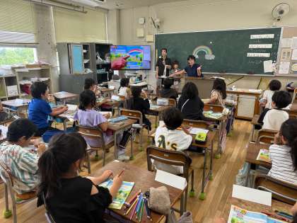 好きな色ににじをぬります。それぞれの色を英語でこたえています。