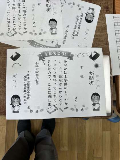 給食健康美化委員会では、1学期のすこやかデーの表彰状づくりをしていました。1学期間のハンカチ・ティッシュチェックで毎回持ってきていた人を来週表彰します。