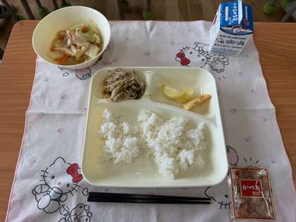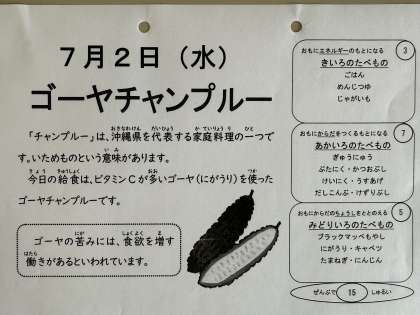 今日のこんだては、ゴーヤチャンプル・かつおぶし・五目汁・焼きじゃがです。ゴーヤチャンプルはほどよい苦みで、子どもにも食べやすかったです。