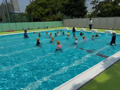 1・2年生は、あそびのぶぶんを多く取り入れながら、プール水えいをたのしむようにしています。