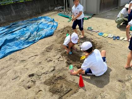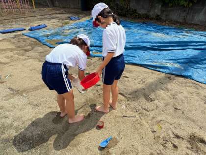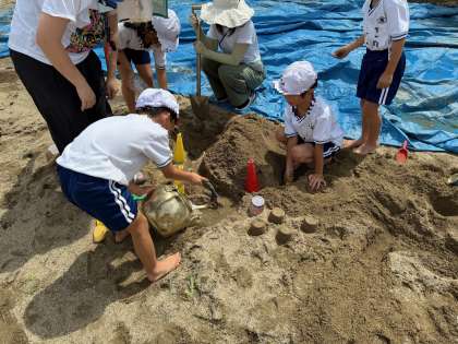 1・2年生がいっしょにかつどうしました。すなばでは、お山をつくったり、川をつくったりしました。