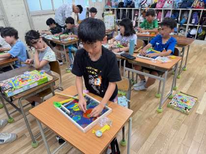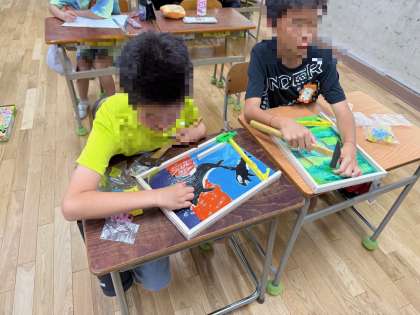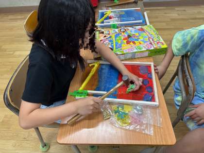 今日は最後のしあげのくぎ打ちです。玉のころがるコースを考えて、くぎを打っていきます。
