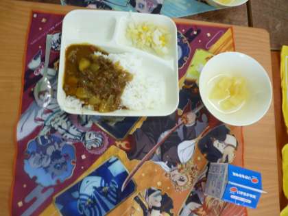 今日のこんだては、夏野菜のカレーライス・サワーソテー・洋なし(カット缶)です。夏野菜のカレーライスは、カボチャのあまみも感じられ、たいへんおいしかったです。
