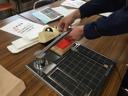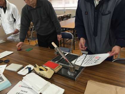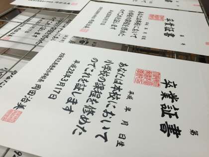 17日の卒業式に手渡す卒業証書。小学校6か年の想い出とともに一人ひとりに授与します。大切な証である卒業証書は、心をこめて名前を書き、所定の場所に公印を押してつくります。