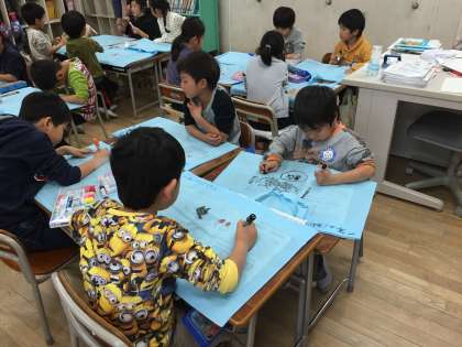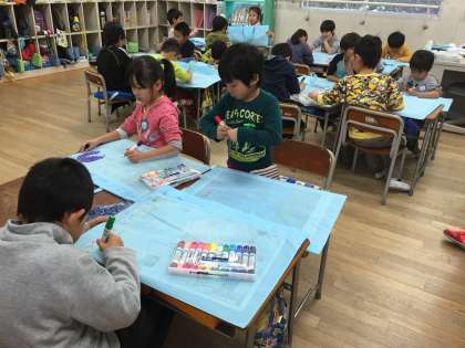 1年間、自分が描いた絵や版画などを持ち帰るための作品袋を製作しています。この作品袋を一年生から保存しておけば、6年間の歩みがわかります。