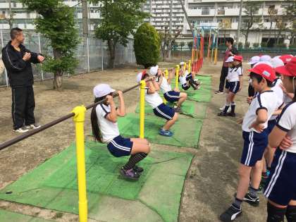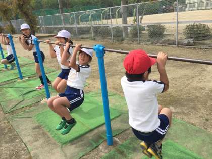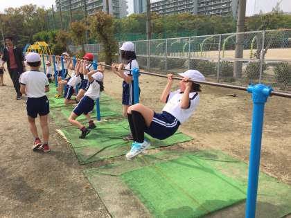 南港光小学校は広い運動場や芝生広場があり、運動をするにはたいへん恵まれた環境にあります。外遊びを進めてきたこともあり、全国体力調査でも毎年、全国を上回る結果を残していますが、握力だけは課題となっています。4年生はさかんにうんていや鉄棒をつかって握力を高める運動をしていました。