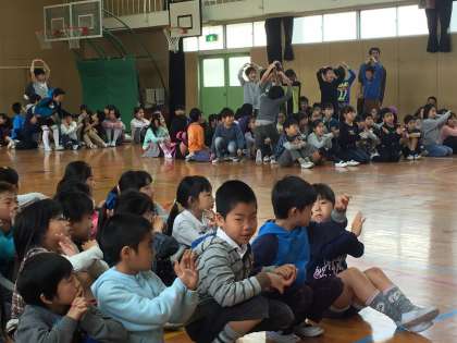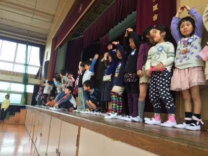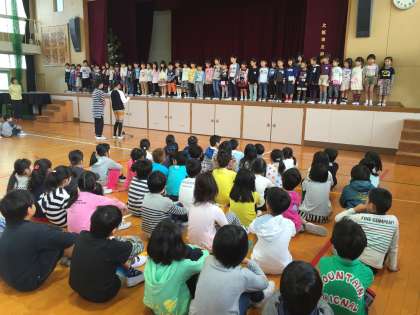 児童会の代表から、お迎えの言葉がありました。南港光小学校についての○×クイズもしました。楽しい時間をみんなですごして、はじめての全校集会を終えました。