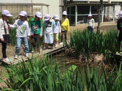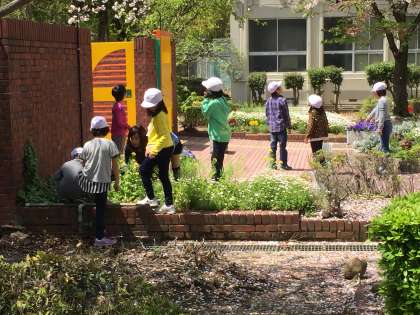 あたたかな春のひざしの中で、子どもたちと自然のふれあいは始まっています。校内を回り、春の芽生えを探します。みずすましやおたまじゃくし、草花の中に季節を見つけることができます。光小学校はビオトープがありますから、カエルもめだかもいます。