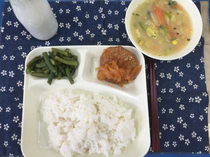 今日(18日)の給食は、煮込みハンバーグ、コーンスープ、三度豆のサラダでした。ハンバーグは子どもたちに人気のメニューですが、あわせて三度豆のサラダや野菜たっぷりのスープもしっかりと食べていました。
