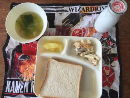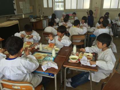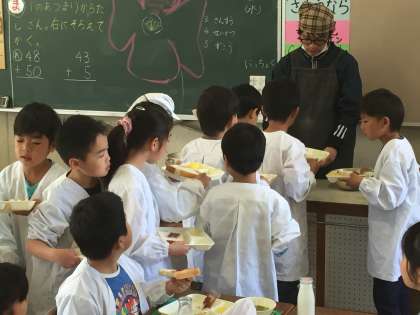 今日の給食は、マカロニグラタン、レタスのスープ、りんごでした。このところ、子どもたちに人気のある献立が続いています。2年生の教室をみると、おかわりをする列ができていました。