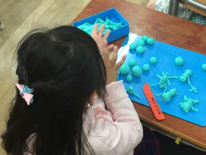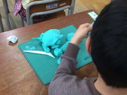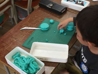 1年生は粘土でいろいろなものをつくります。心の中に浮かんだものを、自分の手で形にしていきます。これらを見ていると、言葉以外の表現の豊かさを感じます。
