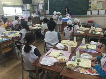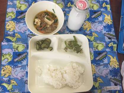 今日の給食は、マーボーどうふ、きゅうりの甘酢づけ、じゃこピーマンでした。じゃこピーマンは、その名の通り、ちりめんじゃことピーマンを味付けした炒めものです。3年生の子どもたちを見ているとピーマンが苦手な子も、喜んで食べています。