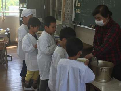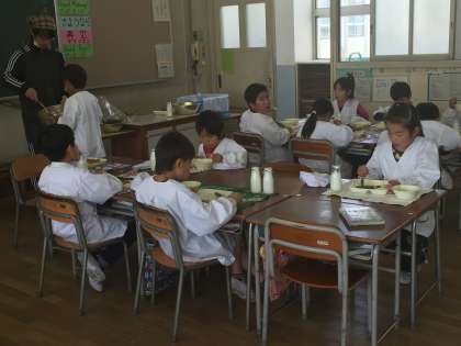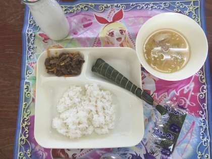 今日の給食は、子どもの日の行事献立でした。牛肉のちらしずし、すまし汁、ちまきが出ました。年間にいくどかは行事に合わせた献立があります。2年生は大喜びでした。