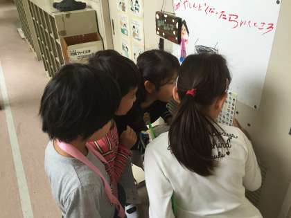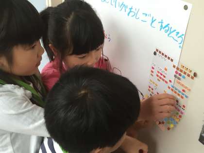 今年の1年生は活動的で、すでに学校のいろいろなところを見て回っています。でも、学校は広いですから、知らない部屋もずいぶんとあったみたいです。訪れた部屋の前にはシールがあり、自分のシートに、はり付けていきます。