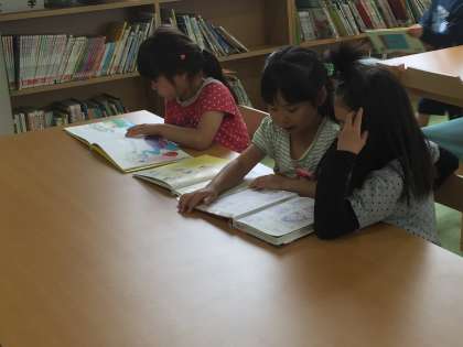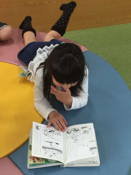 今日は雨でした。外で遊べない時のすごし方は、いろいろあります。図書室で本を読むというのもその一つです。子どもたちは、リラックスして読書を楽しんでいます。