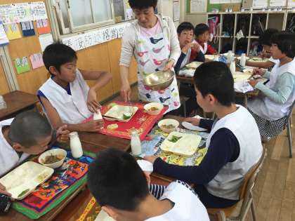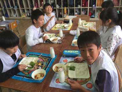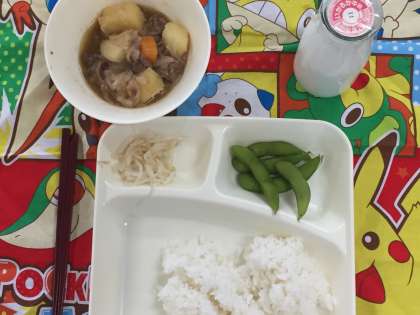 ひさしぶりの給食でした。献立は、肉じゃが、もやしのゆずの香あえ、枝豆でした。肉じゃがはもちろんですが、もやしも人気がありました。