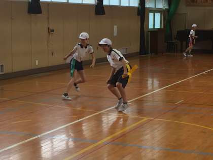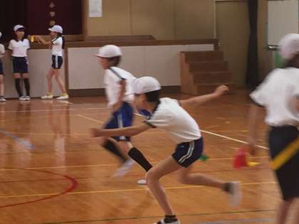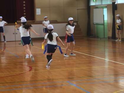 雨天のため外で運動することはできません。でも、子どもたちは体育館で思い切り体を動かしています。腰につけたタグを取り合って、フロアを駆け巡っていました。