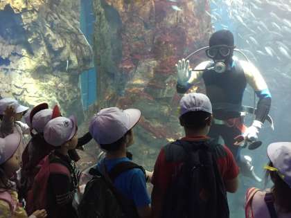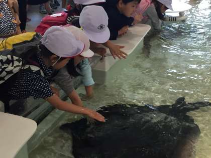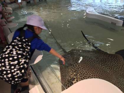 水槽をきれいにしている人とあいさつをしました。体験コーナーでは、エイやサメをこわがらずにさわることができました。