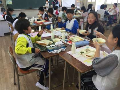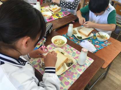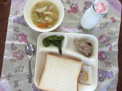 今日の給食は、かつおのガーリックマヨネーズ焼き、グリーンアスパラガスのソテーにスープでした。かつおの風味が口の中にひろがって、とてもおいしかったです。