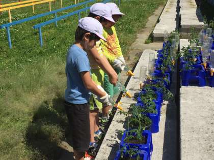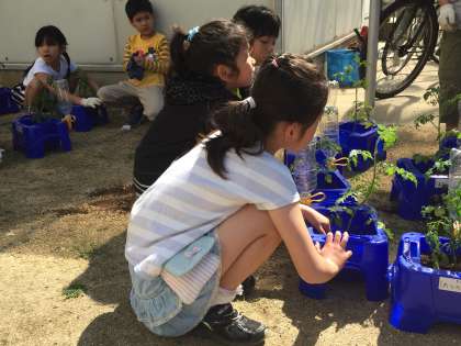 2年生がミニトマトを植えました。もらった苗を大事そうに鉢に植えていました。かわいいミニトマトがいっぱいできるといいね。