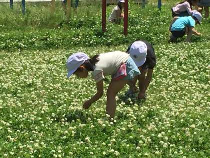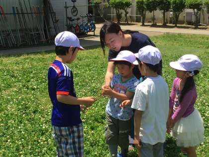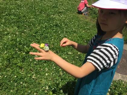 テントウムシやチョウなどいろいろな虫たちが、芝生にやってきます。お花をあつめて、花飾りをつくている子もいました。